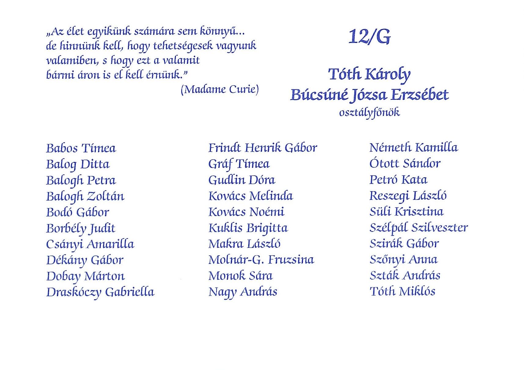 Osztályfőnök: Tóth Károly, Búcsúné Józsa Erzsébet